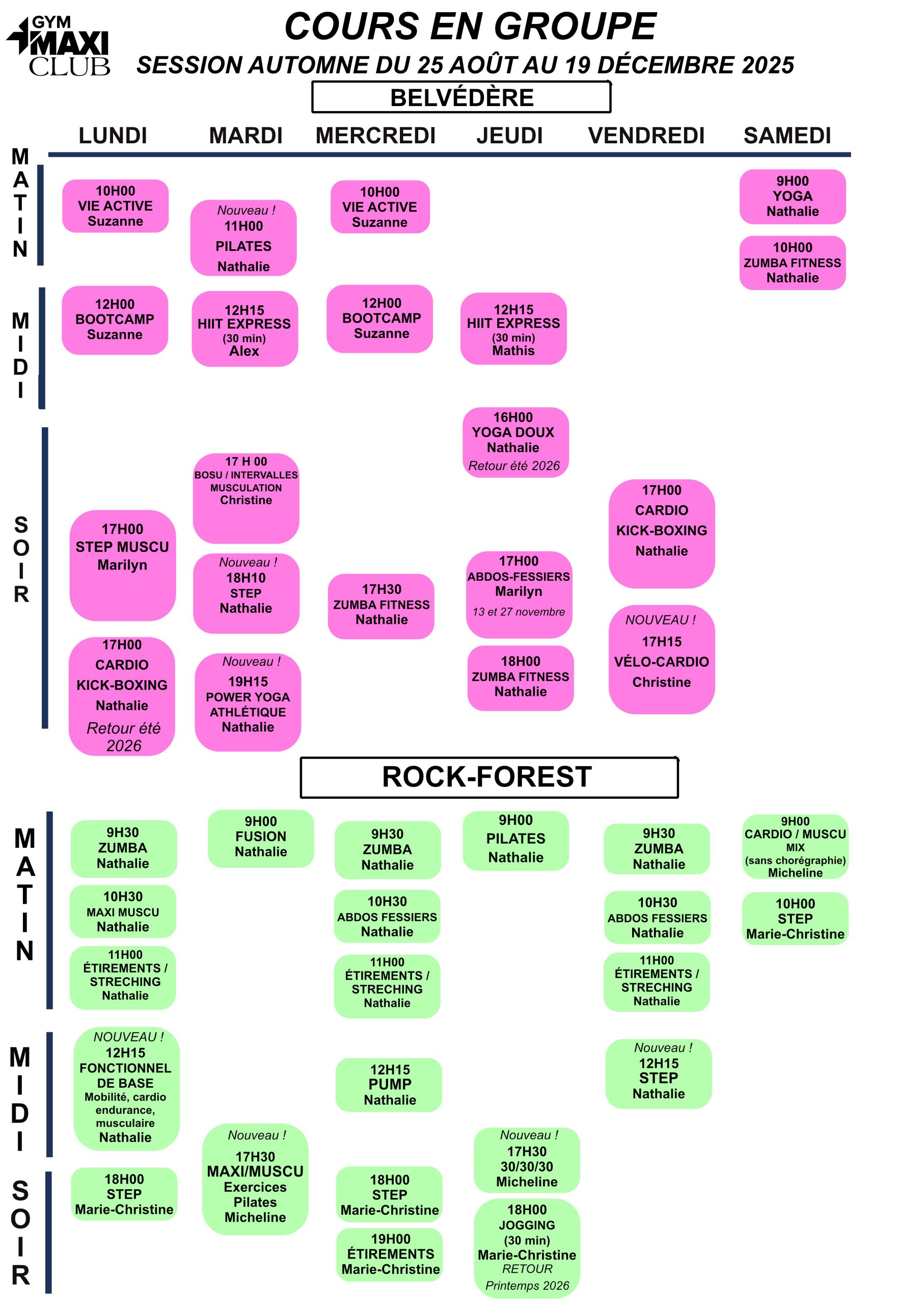 Découvrez la liste de nos cours en groupe et l’horaire.